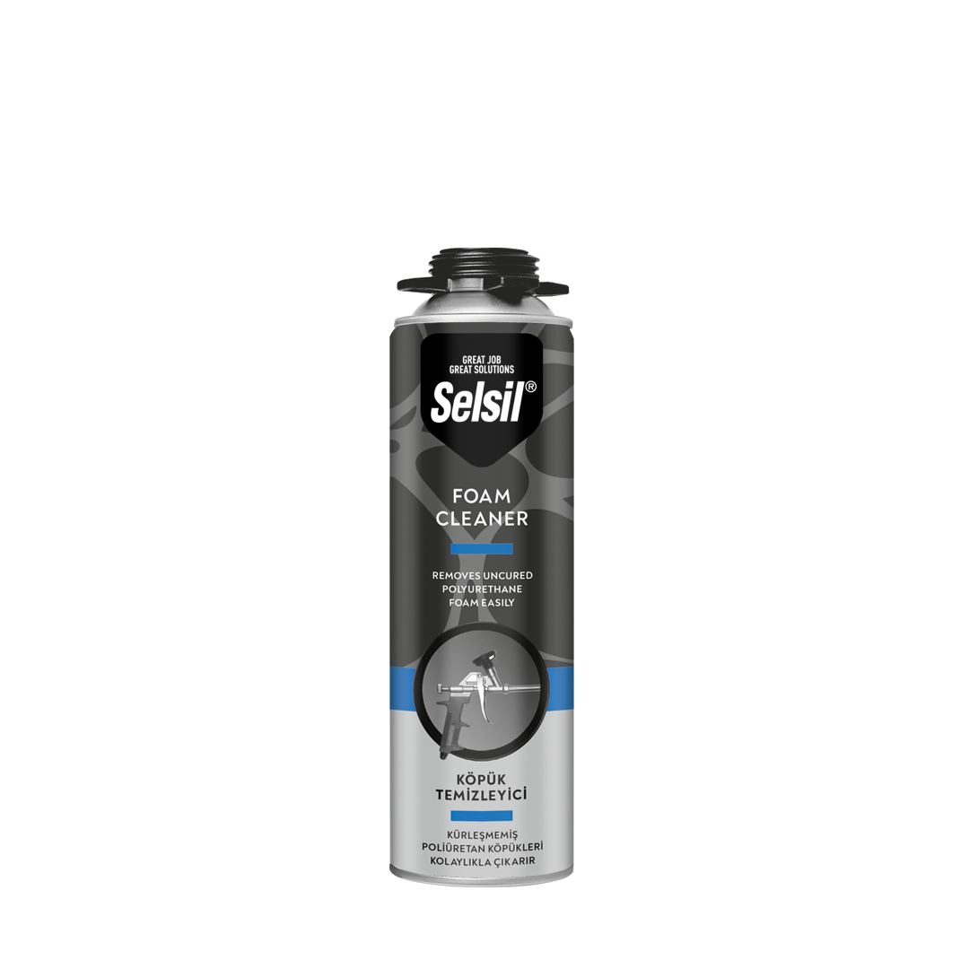 Selsil Köpük Temizleyici, kullanım sonrası püskürtme tabancalarından taze poliüretan köpükleri çıkaran bir temizleyicidir. Yüzeyleri, giysileri, kapı ve pencere pervazlarını temizler ve püskürtme tabancalarının içinde sertleşmeyi önler.